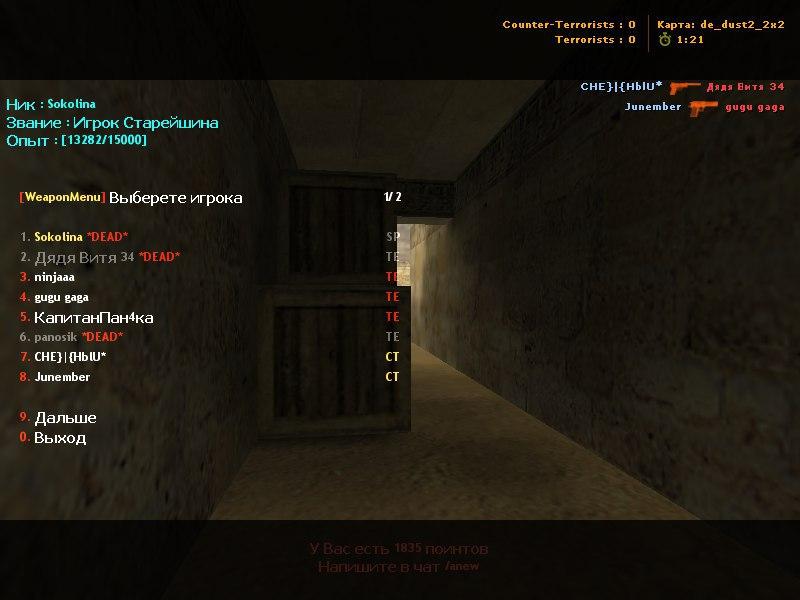 • Далее Вы увидите такое же меню, как меню закупки, только закупать Вы будете оружия выбранному игроку (бесплатно конечно). Максимально удобно, действия происходят ровно так, как при меню закупки. Даже не надо будет читать каждый пункт, руки сделают все за Вас
