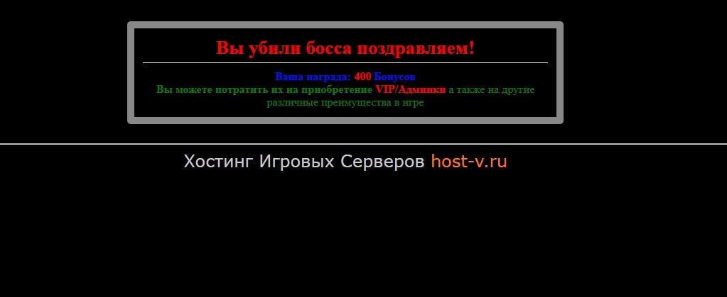 Дополнительный плагин для плагина ScorpionBoss Автора Alexander.3 Плагин добавляет возможность выдавать бонусы от плагина Army Ranks Ultimate За победу над боссом. Тот кто убивает босса начисляются бонусы в нужном количестве (настраивается в конфиге) а так же показывает MOTD окно победителю и игрокам (на скриншотах видно)