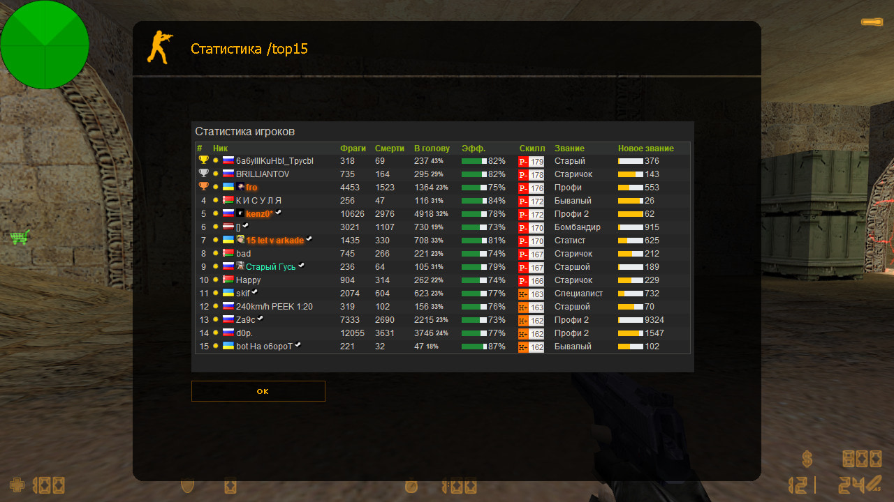 Важный момент! Некоторые старые ноустим сборки блокируют показ такого motd окна, с этим ничего не сделать, поэтому в конфиге есть квар statsx_top_enable, который позволит открывать новое motd окно только игрокам со стим или gs клиента, а остальным покажет обычный top15 из плагина statsx