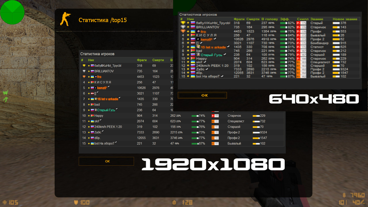 - Адаптивность. Данных много, но они влезают на любом разрешении у игрока! Даже на 640x480 влезают все 15 игроков в мотд и отображаются нормально (адаптивность работает только на современных NoSTEAM сборках и разумеется на STEAM)