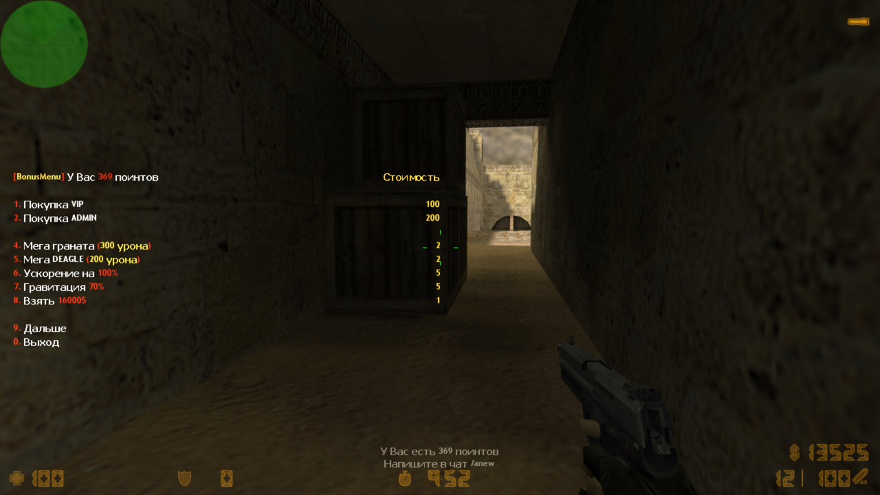 • Выдает достаточное большое количество бонусов (ускорение, деньги, прозрачность, хп, возрождение, урон, прыжки, банихоп, патроны, покупка опыта, покупка админки/випки, ну и конечно же любой вид оружия)