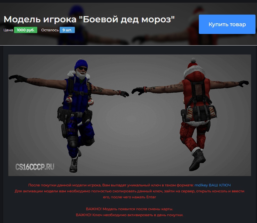 Позволяют создавать готовые ключи для моделей игроков. После покупки ключа, нужно зайти на сервер и в консоли вставить скопированную строку в формате wpnkey/mdlkey ключ. После смены карты или рестарта сервера, можно будет выбрать модель игрока в Model Menu. Выбор модели игрока сохраняется в nVault, а значит, после реконнекта на сервер, модель будет сразу установлена игроку. Модели игроков не подгружаются заранее, только после покупки и успешной активации на сервере. Настройки смотрите в конфигах.