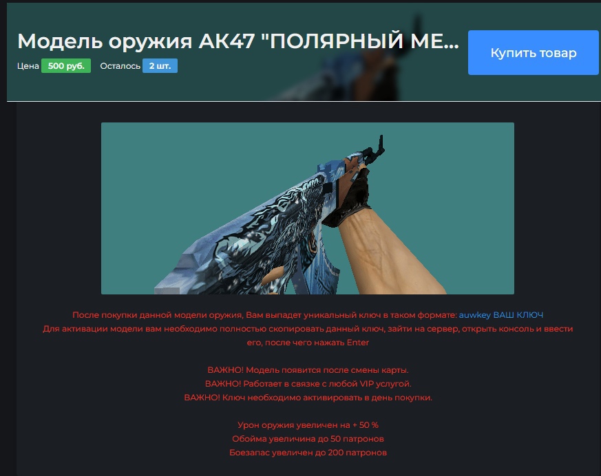 Позволяют создавать готовые ключи для бонусов AES. После покупки ключа, нужно зайти на сервер и в консоли вставить скопированную строку в формате wpnkey/mdlkey ключ. После чего в игре вам будут начислены бонусы. Настройки смотрите в конфиге.