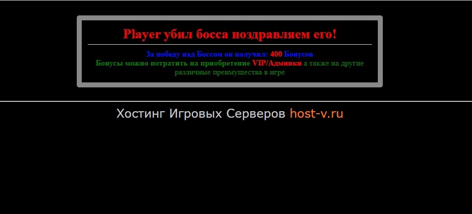Дополнительный плагин для плагина ScorpionBoss Автора Alexander.3 Плагин добавляет возможность выдавать бонусы от плагина Army Ranks Ultimate За победу над боссом. Тот кто убивает босса начисляются бонусы в нужном количестве (настраивается в конфиге) а так же показывает MOTD окно победителю и игрокам (на скриншотах видно)