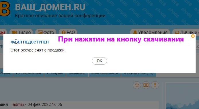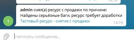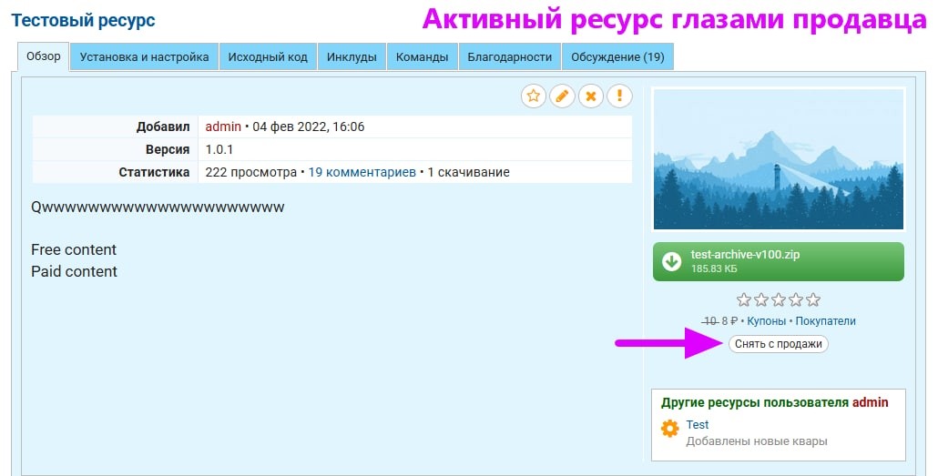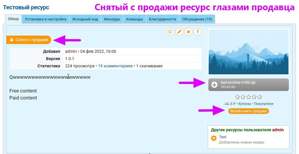 Добавлена возможность снимать ресурс с продаж. Удобно если вы по какой то причине решили приостановить продажу своего ресурса временно или постоянно. Так же есть возможность снова открывать продажу. Все снятые с продажи ресурсы попадают в отдельную Группу, там их можно просматривать, читать комментарии, а также видеть причину снятия с продажи. На скриншотах ниже можно визуально ознакомится с данным дополнением на форуме.