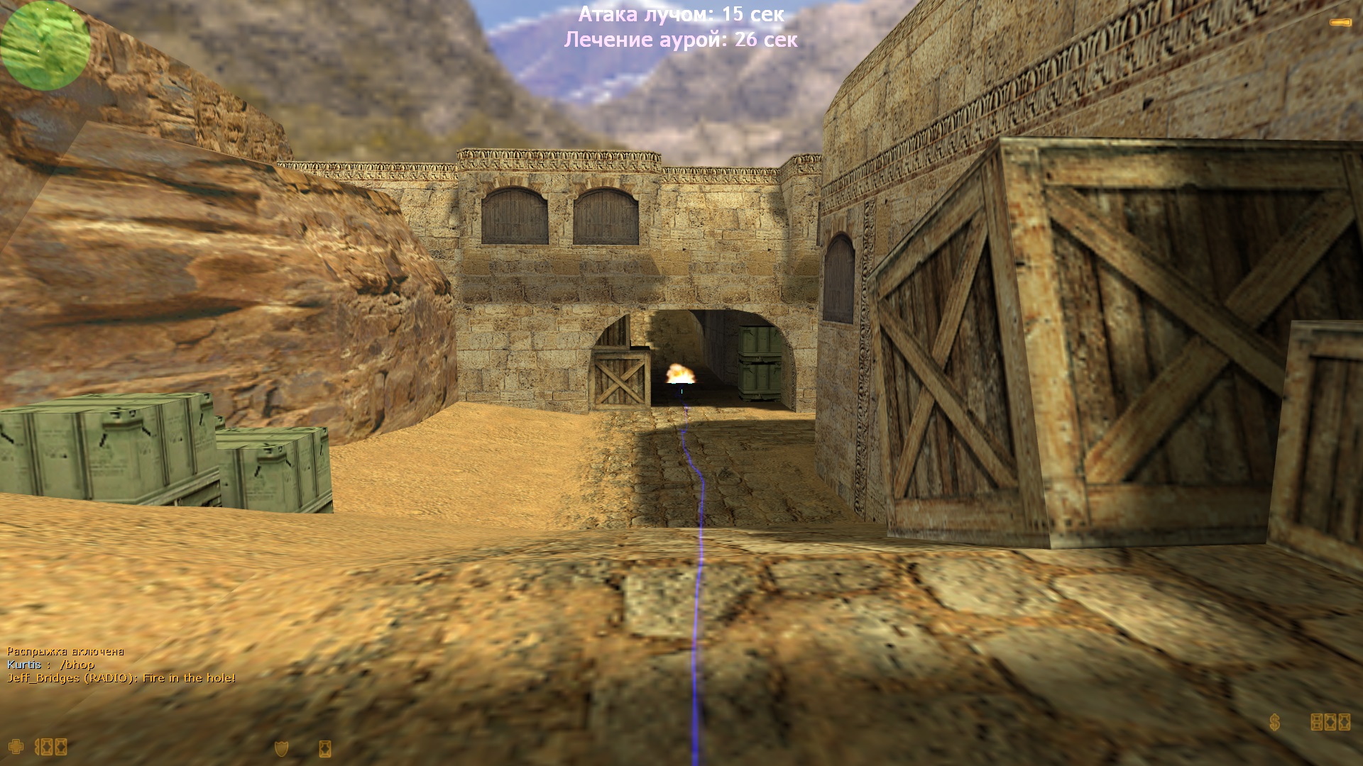1. Атака лучом: при нажатии ЛКМ (если перед вами нет врага для прямой атаки) выпускается луч по направлению прицела, которой в конечной точке наносит урон по врагам в радиусе.
