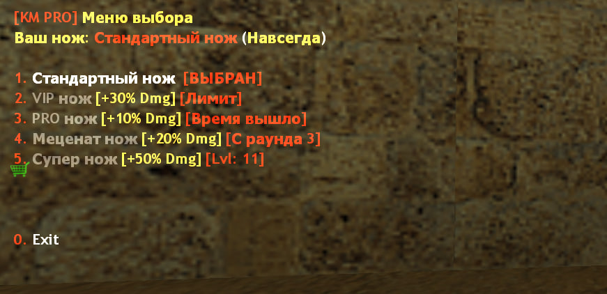Меню отображает статус ножей: доступен ли он по уровню, флагу доступу амхх, ограничен ли по раунду или лимиту.