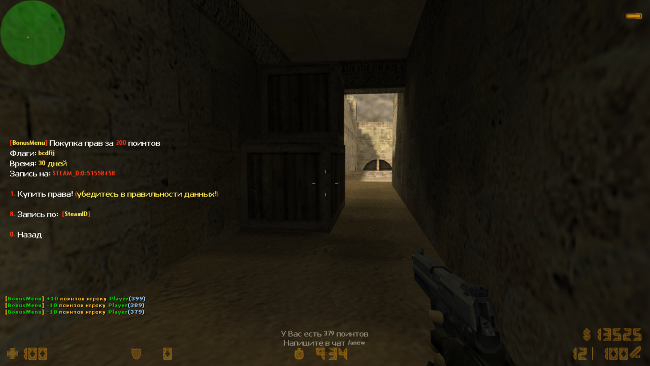 • Выдает достаточное большое количество бонусов (ускорение, деньги, прозрачность, хп, возрождение, урон, прыжки, банихоп, патроны, покупка опыта, покупка админки/випки, ну и конечно же любой вид оружия)