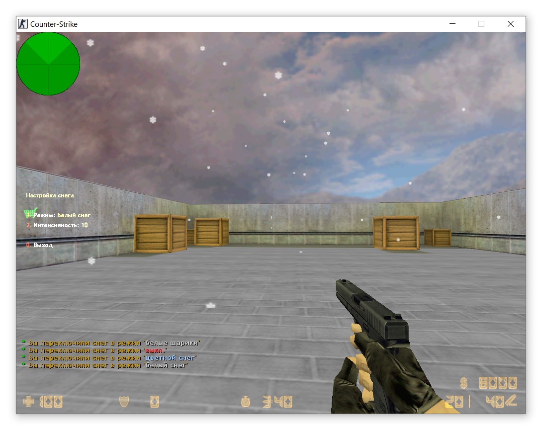 Снег на сервере с возможностью персонального отключения клиентом. Два режима (снег/шарики), два подрежима (белый/цветной). При первом входе на сервер клиент получает предложение включить снег, далее интенсивность снегопада и тип снега (в т.ч. выключение снега) регулируется через меню (say /snow).