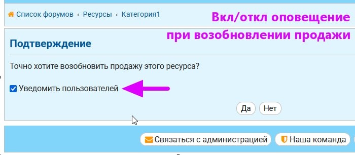 Добавлена возможность снимать ресурс с продаж. Удобно если вы по какой то причине решили приостановить продажу своего ресурса временно или постоянно. Так же есть возможность снова открывать продажу. Все снятые с продажи ресурсы попадают в отдельную Группу, там их можно просматривать, читать комментарии, а также видеть причину снятия с продажи. На скриншотах ниже можно визуально ознакомится с данным дополнением на форуме.