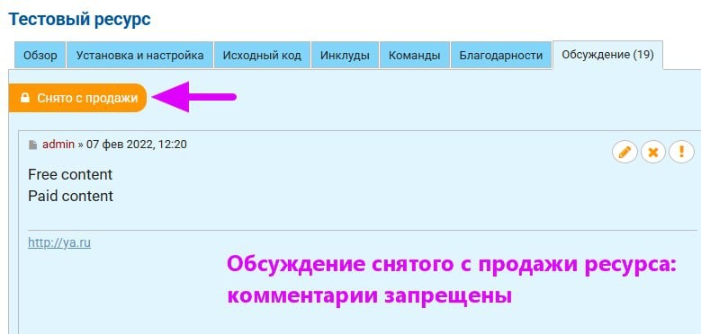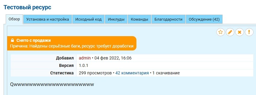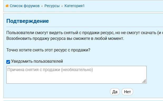 Добавлена возможность снимать ресурс с продаж. Удобно если вы по какой то причине решили приостановить продажу своего ресурса временно или постоянно. Так же есть возможность снова открывать продажу. Все снятые с продажи ресурсы попадают в отдельную Группу, там их можно просматривать, читать комментарии, а также видеть причину снятия с продажи. На скриншотах ниже можно визуально ознакомится с данным дополнением на форуме.